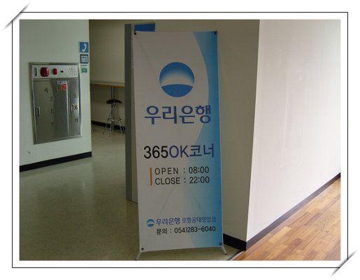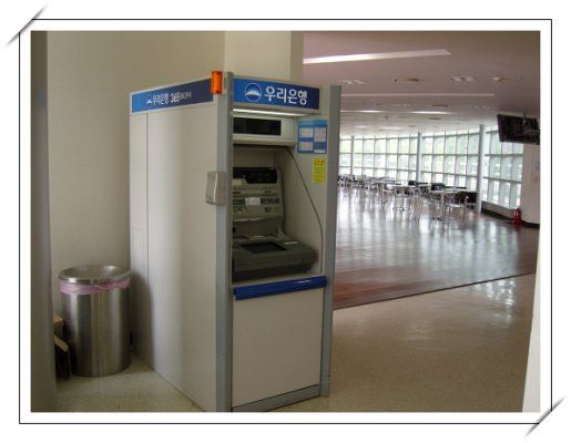 포스텍 구성원들은 스마트카드를 대부분 가지고 다닙니다. 도서관 이나 기타 건물을 출입하거나 식사를 하고 편의점에서 물건값을 치를 때 사용하기도 하지요. 스마트카드는 우리은행과 연계되어 있고 도서관 6층에는 우리은행 현금인출기가 있습니다. 6층은 24시간 개방되어 있기 때문에 밤10시까지는 현금인출기를 사용하실 수 있습니다. 은행 영업시간에는 수수료가 없지만 영업시간이 끝난 저녁쯤에는 수수료가 붙습니다.